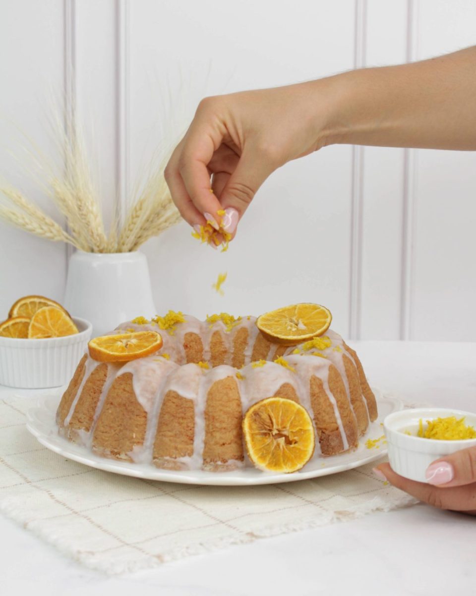 Delicioso y esponjoso pan con un toque de esencia de naranja, bañado en un dulce glaseado con ralladura fresca y decorado con naranjas deshidratadas. Una explosión de sabor a cítricos en cada bocado.